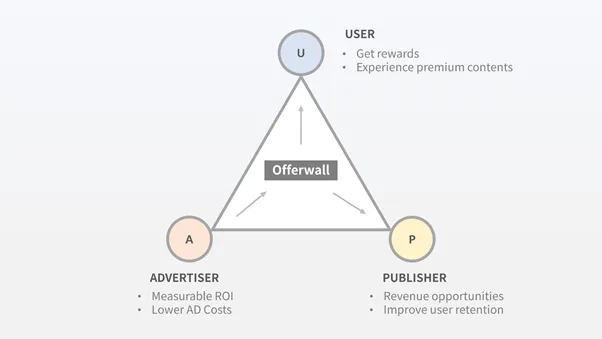 반면에 오퍼월의 리워드 광고는 광고주와 플랫폼뿐만 아니라 이용자에게도 이득이 되는 구조입니다. 오퍼월은 원치 않는 영역에서 광고를 보여주는 것이 아니라, 이용자가 혜택을 받기 위해 자발적으로 광고에 참여하는 방식입니다. 사용자가 보상형 광고를 원하는 이유는 돈을 지불하지 않아도 시간을 들이기만 하면 특정 혜택을 얻거나 프리미엄 콘텐츠를 무료로 즐길 수 있기 때문입니다. 이런 특성 덕분에, 사용자들은 명확한 보상과 혜택을 얻기 위해서 개인정보 수집도 기꺼이 수락하게 됩니다.