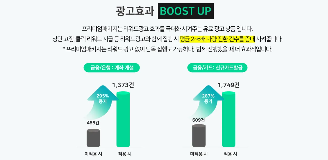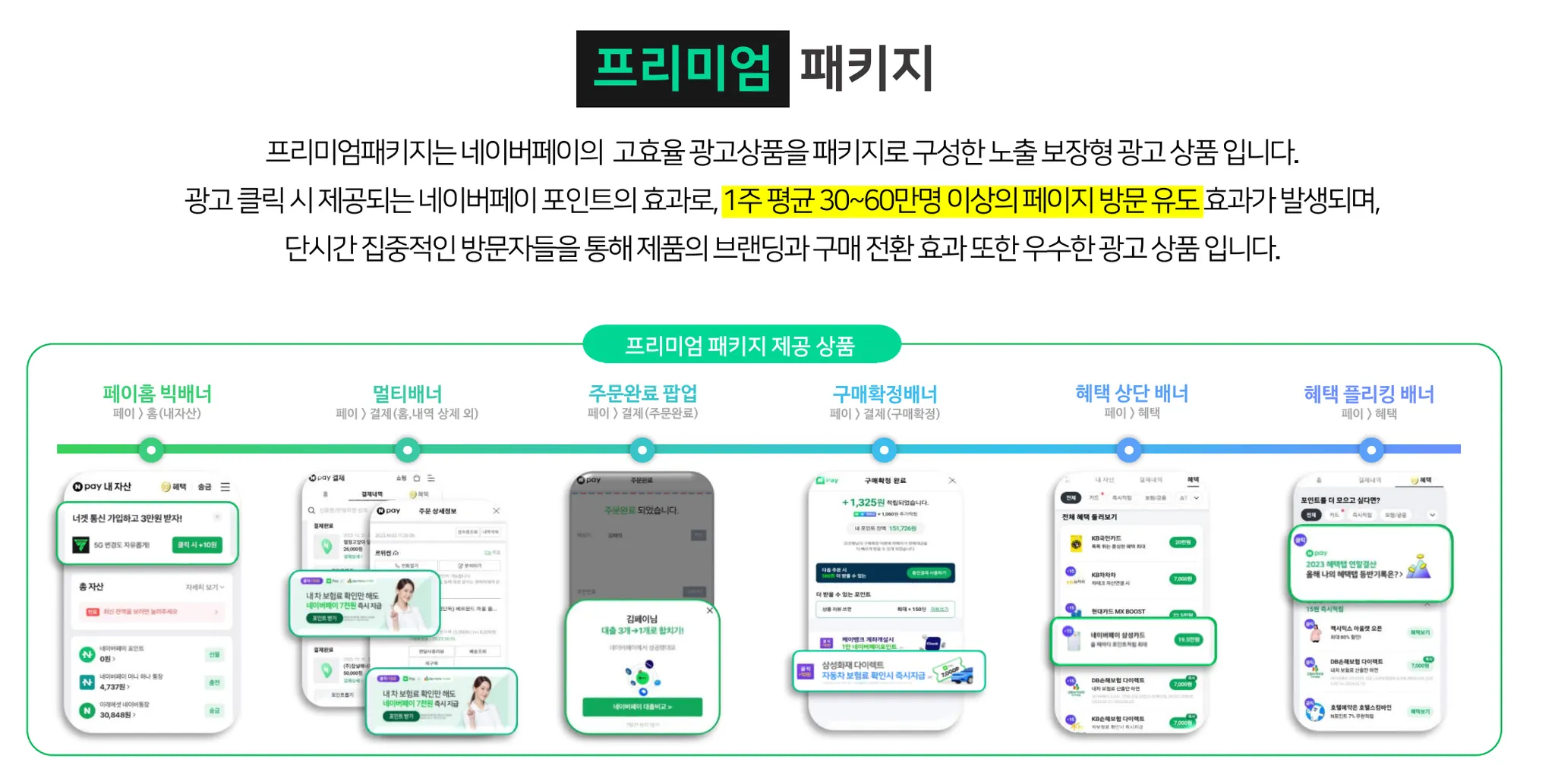 <프리미엄패키지>는 네이버페이의 고효율 광고상품을 패키지로 구성한 노출 보장형 광고상품입니다. 광고 클릭 시 제공되는 네이버페이 포인트의 효과로 단기간 집중적(1주 평균 30만 명 이상)으로 페이지 방문 유도할 수 있으며, 단시간 집중적인 방문자들을 통해 제품의 브랜딩과 구매 전환 효과가 우수한 광고상품입니다.