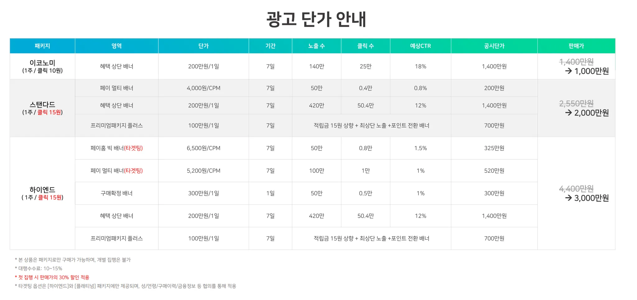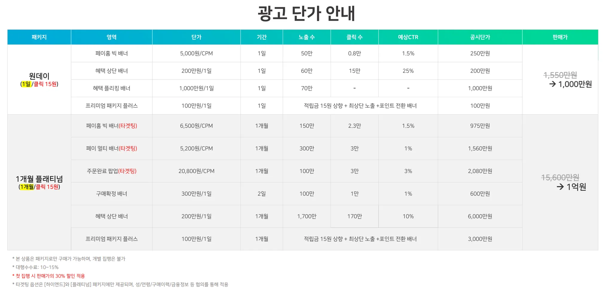 네이버페이 내 프리미엄 배너를 활용할 수 있는 <프리미엄패키지>의 단가를 30% 할인 지원합니다.
