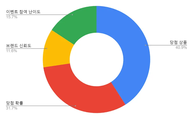 사용자들은 이벤트 참여의 요소에서 1순위로 '당첨 상품(40.9%)', 그리고 2순위로 당첨 확률(31.7%)'을 뽑았어. 어떻게 보면 너무나 당연한 결과지. 이벤트에 참여하는 입장에서 생각해보면 어떤 상품을 받을 수 있는지, 현실적으로 당첨될 확률이 있을지를 가장 먼저 확인하게 되잖아?