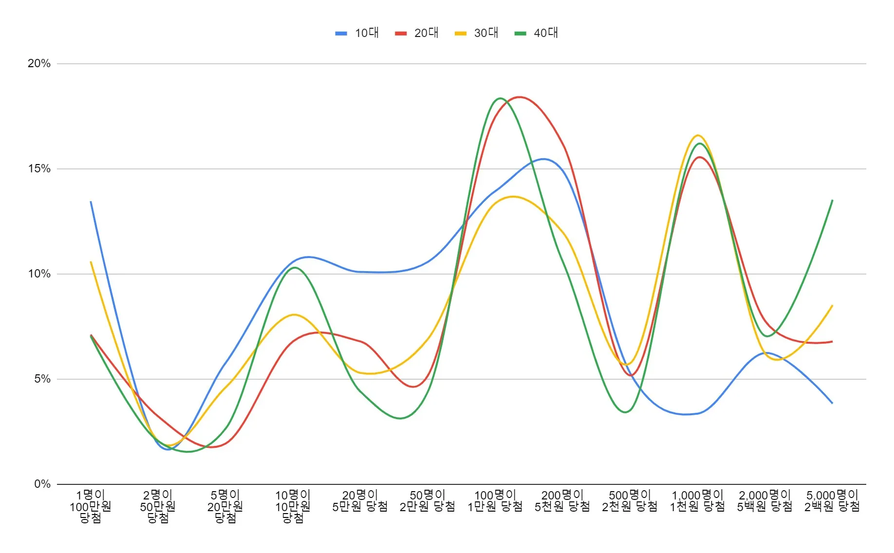 평균적으로 세 가지 선택지 모두 거의 유사한 응답수를 얻었어. 중간 확률인 [100명이 1만 원 당첨]이 36%로 가장 많은 선택을 받았지만, 나머지 선택지와 3%~5% 정도 밖에 차이가 나지 않았지. 하지만 연령별로 구분해보니 조금 특이한 점이 있었어. 10대 사용자의 응답이 유난히 눈에 띄었거든. 위 그래프에서 파란색 선이 보이지? 10대 사용자들은 다른 연령대에 비해서, 당첨확률은 매우 낮지만 보상이 높은 이벤트에 대한 선호도가 상대적으로 매우 높았어(42%). 반대로 당첨 확률은 높지만 보상이 낮은 이벤트는 거의 선택하지 않았지(17%).