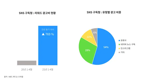 바야흐로 기업들의 SNS 마케팅 전성시대입니다. 최근 많은 기업들이 MZ세대와 접점을 넓히기 위해 인스타그램, 유튜브 등의 채널을 확장하고 있습니다. NBT의 내부 데이터에 따르면, SNS 구독형 상품의 집행비용은 전년동기 대비 8.6배 이상 증가했습니다. 특히 유튜브 구독형 광고비는 20배 이상 늘어나는 등 기업들의 유튜브 성장에 대한 수요가 압도적으로 커졌습니다. 전체 인구에서 33%가량을 차지하는 MZ세대는 사회 진출이 본격화되면서 우리 사회의 주 소비층으로 부상하고 있는데요. 이에 발맞춰 기업들은 SNS을 활용한 MZ세대와의 소통 방법을 모색하고 있습니다.