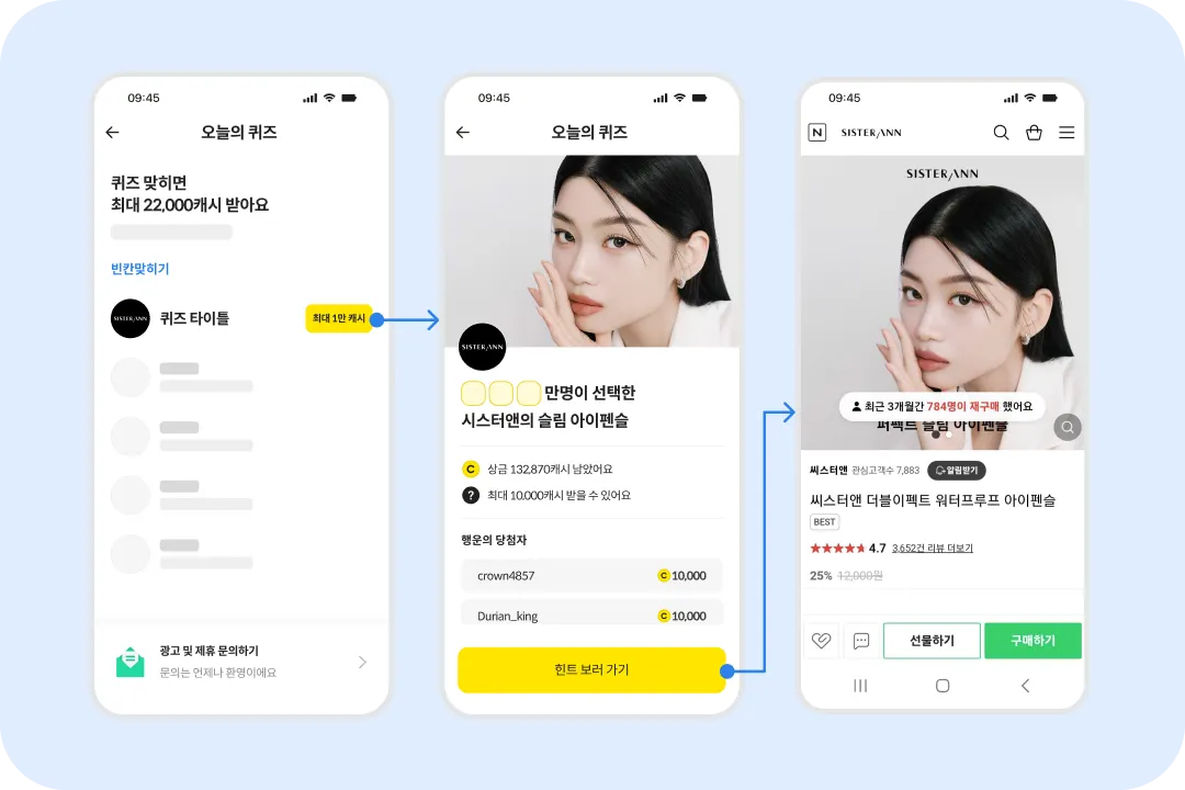 유저가 퀴즈의 정답을 찾기 위해 상세 페이지를 탐색하며 자연스럽게 인지와 전환까지 이어지는 퀴즈형 상품입니다.