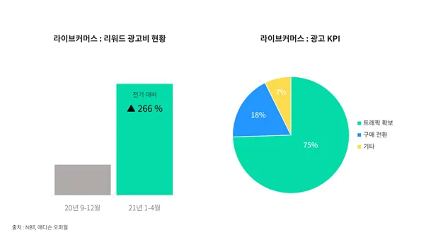 라이브 커머스의 트래픽 확보를 위한 광고 수요도 크게 증가했습니다. 일반적인 커머스의 경우 구매전환을 광고 KPI로 잡는 경우가 많은데 반해, 라이브 커머스는 아직 초기 단계인만큼 동시접속자수, 조회수 등의 고객 유입이 주요 목적입니다. 실제로 ‘애디슨 오퍼월(Adison Offerwall)’에서 진행한 라이브 커머스 광고는 알림 신청, 시청 인증 등 트래픽 확보를 위한 광고비 비중이 약 75%를 차지하며 구매전환보다 현저히 높았습니다. 유통업계의 한 관계자는 기사를 통해 "거래가 이뤄지지 않더라도 한 번 방송하면 수천 명에서 수만 명이 보기 때문에 홍보를 위해 라이브 커머스를 하는 업체들이 많다"고 언급하기도 했습니다.