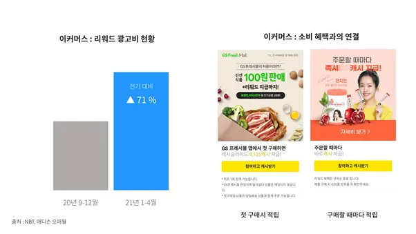쿠팡, 쓱닷컴, 11번가, 마켓컬리, B마트 등 이커머스 플랫폼의 매출이 많게는 전년 대비 두배 가량 성장했습니다. 이렇듯 코로나 특수를 누리면서 온·오프라인 유통업체에 관계없이 모든 유통 채널이 식료품과 생필품을 1시간 내로 배달하는 퀵커머스에 뛰어들고 있습니다. 뿐만 아니라 유통업계의 최저가 경쟁이 뜨겁게 달아오르는 분위기입니다. 리워드 광고 시장에서도 작년에 비해 이커머스의 광고비가 전기 대비 약 71% 증가했습니다. 올해부터 소비심리가 크게 회복되면서 주도권을 잡기 위한 경쟁은 앞으로 더 심화될 것으로 보입니다.