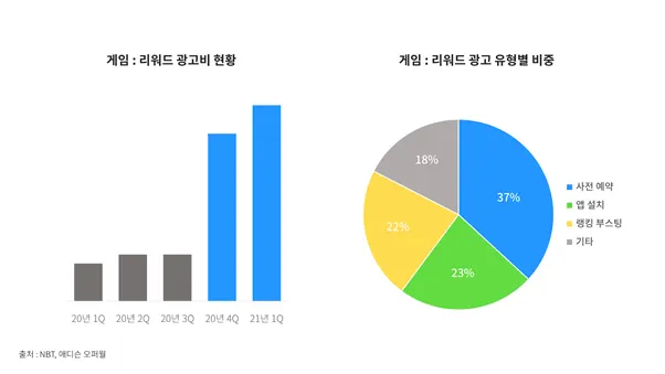 집에서 보내는 시간이 길어지면서, 작년 한 해 동안 게임 시장은 코로나 특수를 톡톡히 누렸습니다. 올해도 모바일, PC, 콘솔을 포함한 게임 시장의 가파른 성장세가 이어졌습니다. 모바일 인덱스 리포트에 따르면, 국내 모바일 게임 시장은 올해 1분기에만 1조 6555억 원으로 역대 최고 분기 거래액을 달성했습니다. 코로나로 인한 재택근무 등으로 출시가 연기되었던 신작들이 출시되기 시작한 것인데요. 이에 따라 게임사의 리워드 광고 집행수도 크게 증가하는 것을 볼 수 있습니다. 올해 하반기에도 대형 신작들이 출시될 예정이어서 국내 게임 시장의 호황기는 계속 이어질 것으로 기대됩니다.